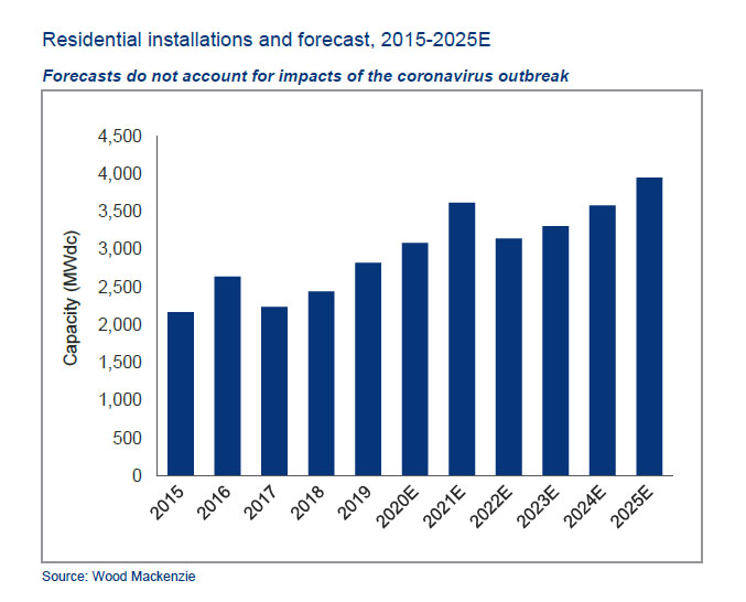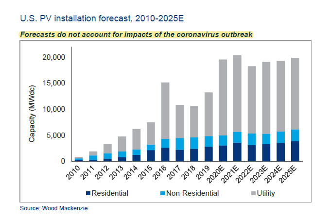 Wood Mackenzie預(yù)測(cè),2020年的年增長(zhǎng)率為47%,預(yù)計(jì)裝機(jī)量將達(dá)到20 GW,在投資稅收抵免到期之前,2021年年裝機(jī)量在20.4 GW,未來(lái)五年,美國(guó)光伏總裝機(jī)容量將翻一番以上。到2025年,三分之二的屋頂太陽(yáng)能和四分之一的非住宅太陽(yáng)能將配備儲(chǔ)能。需要注意的是,WoodMac表示該報(bào)告在出版時(shí)COVID-19病毒仍在全球蔓延,對(duì)太陽(yáng)能行業(yè)的影響仍在發(fā)展中,鑒于這種動(dòng)態(tài)變化,WoodMac暫未將病毒爆發(fā)的影響納入該報(bào)告。