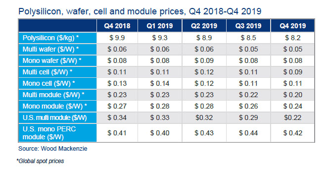 2019年第四季度,所有主要組件的全球現(xiàn)貨市場(chǎng)價(jià)格均比上一季度有所下降。由于第四季度多晶硅價(jià)格下降了3.5%,導(dǎo)致單晶硅片和多晶硅片價(jià)格相應(yīng)下降,由于全球?qū)τ诙嗑Мa(chǎn)品需求的減弱,多晶電池全球現(xiàn)貨價(jià)格連續(xù)兩個(gè)季度下降。2019年第四季度,美國(guó)多晶組件價(jià)格跌至0.22/W。