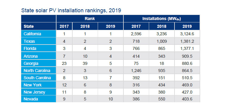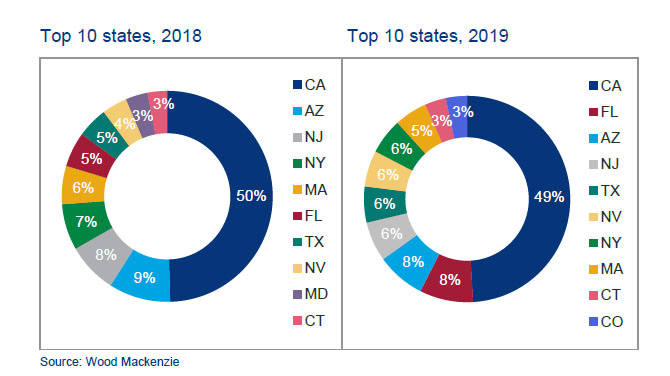 加州大火導(dǎo)致的公共電源停電事件影響深遠(yuǎn),太陽(yáng)能加儲(chǔ)能的彈性能源代替方案催化了住宅光伏市場(chǎng),再加上在2020年新建住宅都需安裝太陽(yáng)能等政策刺激下,綜合因素之下,加州第四季度的新增裝機(jī)量就達(dá)到300MW,全年超過(guò)1GW。佛羅里達(dá)州2019年仍穩(wěn)守其第二大住宅市場(chǎng)的排名,德克薩斯州、內(nèi)華達(dá)州、新澤西州也表現(xiàn)出色。