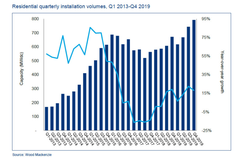 住宅太陽(yáng)能保持健康增長(zhǎng)狀態(tài),相比2018年增長(zhǎng)了15%,是2016年以來(lái)的最高年增長(zhǎng)率。