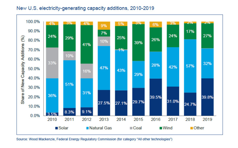 2019年,美國(guó)太陽(yáng)能新增裝機(jī)量占美國(guó)能源新增裝機(jī)總量的近40%,是該行業(yè)歷年以來(lái)最大份額。