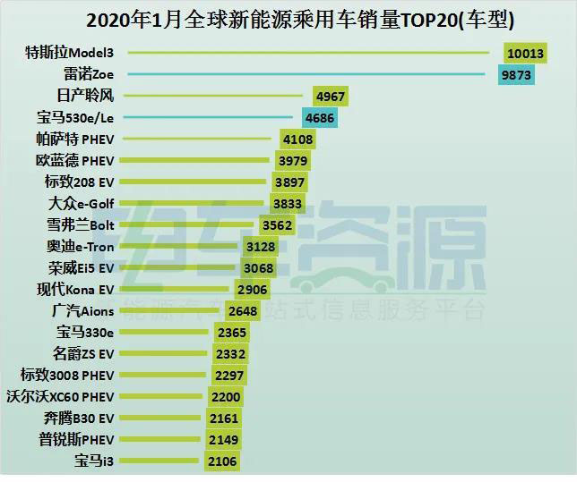 2020年1月全球銷售新能源汽車150613輛,其中前20車企銷量占比高達(dá)82.34%,中國(guó)品牌占前20銷量的18.38%,歐洲品牌占前20銷量的48%。