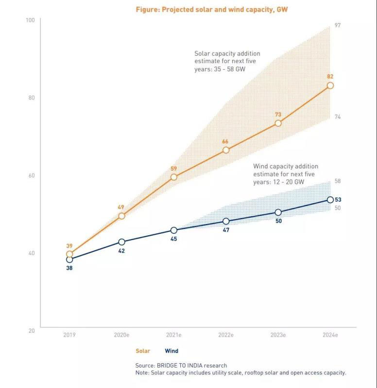 如果維持現(xiàn)有的政策環(huán)境、電力需求和火電PLF等對(duì)可再生能源的發(fā)展軌跡,預(yù)計(jì)到2024年底,太陽能和風(fēng)能發(fā)電容量將分別達(dá)到82 GW和53 GW。2016年印度曾制定了到2022年實(shí)現(xiàn)100GW光伏裝機(jī)量的規(guī)劃,距離這一野心勃勃的目標(biāo)的距離便成了業(yè)內(nèi)衡量印度市場(chǎng)是否繁榮的參照。依照Bridge to India的預(yù)測(cè),印度到2024年較為樂觀的情況才裝機(jī)82GW,顯然100GW光伏目標(biāo)勢(shì)必難以按期完成。