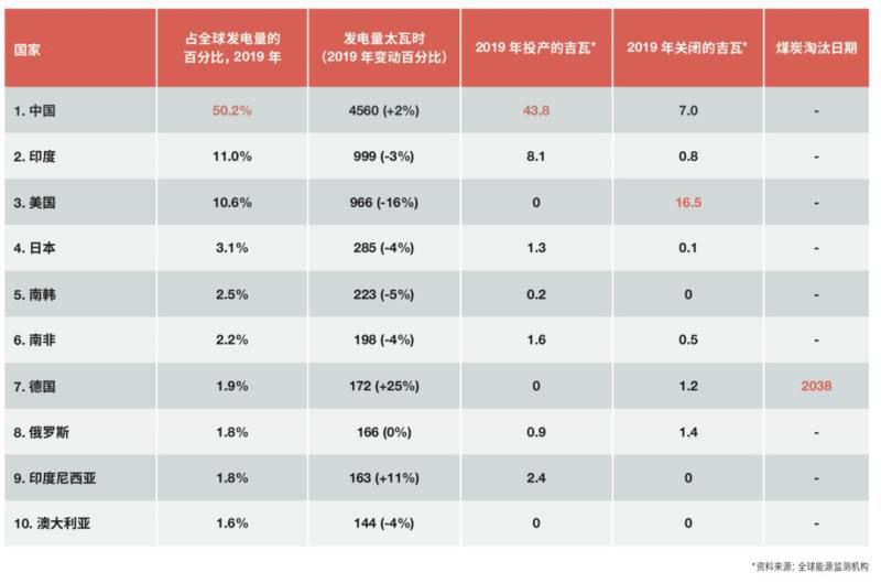 根據(jù)全球能源監(jiān)測(cè)機(jī)構(gòu)的數(shù)據(jù),2019年中國(guó)、印度、美國(guó)、日本、韓國(guó)、南非、德國(guó)、俄羅斯、印度尼西亞、澳大利亞這10個(gè)國(guó)家燃煤電廠發(fā)電量占到全球煤電的87%,其中中國(guó)一個(gè)國(guó)家占50%。除了美國(guó)、德國(guó)、澳大利亞以外,其他7個(gè)國(guó)家在2019年均有新建煤電廠投運(yùn)。在這10個(gè)煤電大國(guó)中,只有德國(guó)確定要逐步關(guān)閉煤電廠,但要等到18年以后的2038年才能完成退煤過(guò)程。