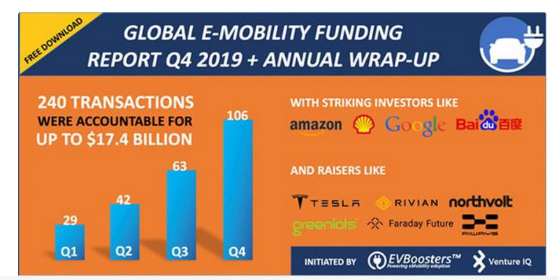 該信息是通過季度電子刊物e-Mobility Funding Report發(fā)布的,該報(bào)告顯示了電動(dòng)汽車生態(tài)系統(tǒng)中幾乎所有的全球融資和收購(gòu)活動(dòng)。報(bào)告中透露,基于164條可追蹤的交易,總共籌集了119億美元,每筆交易的平均價(jià)值為7200萬美元。另外76家公司未透露任何財(cái)務(wù)細(xì)節(jié)?;谶@些數(shù)字,電動(dòng)汽車市場(chǎng)專家預(yù)計(jì),所有與電動(dòng)汽車相關(guān)的公司在2019年總共籌集了150億-170億美元。