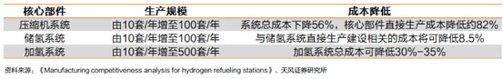 加氫系統(tǒng)年需求量達(dá)到500套時(shí),成本可下降30%-35%。