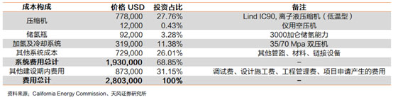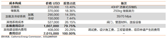 總體上,加氫站建成所需的與設(shè)備相關(guān)的費(fèi)用約為160萬(wàn)美元,考慮投入使用前所需的調(diào)試費(fèi)用、工程設(shè)計(jì)費(fèi)用、管理費(fèi)用、建筑施工費(fèi)用等其他費(fèi)用,總成本將超過(guò)200萬(wàn)美元。