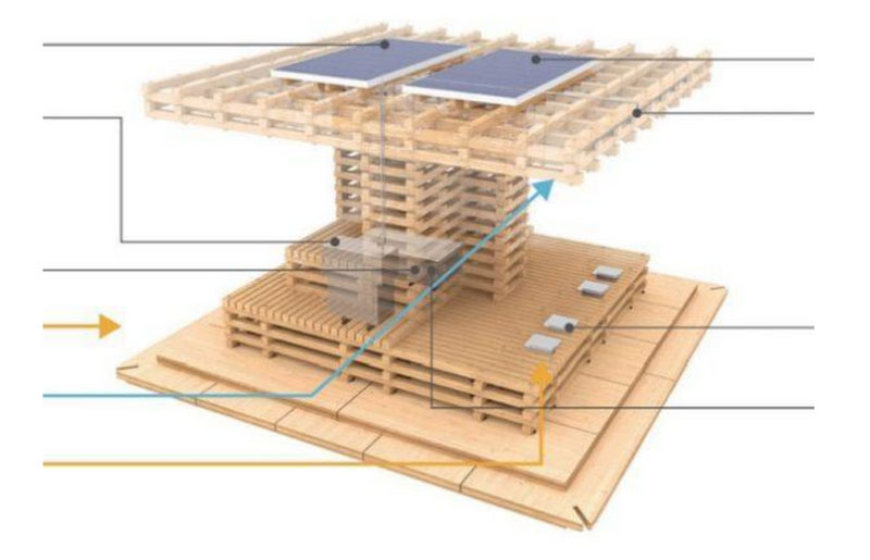 這些公司將該產(chǎn)品宣傳為城市的“熱點(diǎn)”。這個裝置的結(jié)構(gòu)特點(diǎn)是4.8 m?的底板和4 m?的屋頂,中間的空間是休息區(qū)。在該裝置的頂部有一個蒸發(fā)器,玻璃屋頂?shù)脑O(shè)計(jì)可防止直射陽光的傷害。因?yàn)镃ool Tree Lite是由柏木制成的,所以它需要由螺栓連接起來,這種結(jié)構(gòu)方便根據(jù)特殊場合的需求拆卸和重新組裝。
