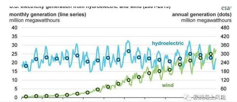 上圖中的空心圓點(diǎn)及右側(cè)坐標(biāo)展示了2001~2019年美國(guó)水電和風(fēng)電的年度發(fā)電量。可以看到,二十年來(lái),水電發(fā)電量較為穩(wěn)定,處在230~320太瓦時(shí)之間,而風(fēng)電則突飛猛進(jìn),從2001年小到小編都讀不出的坐標(biāo)值,增長(zhǎng)到2019年的300太瓦時(shí),占全國(guó)發(fā)電量的7.2%。