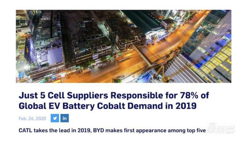 統(tǒng)計(jì)結(jié)果顯示,2019年,鈷使用量排名前5的寧德時(shí)代、LG化學(xué)、松下、比亞迪和三星SDI,共消耗了動(dòng)力電池產(chǎn)業(yè)78%的金屬鈷,而2018年,排名前5的公司僅消耗了動(dòng)力電池產(chǎn)業(yè)69%的金屬鈷。