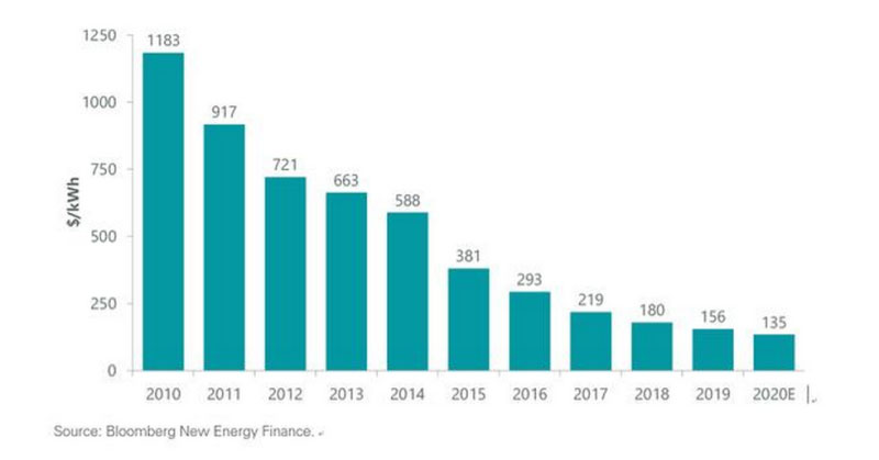 圖四:鋰離子電池價(jià)格持續(xù)下降