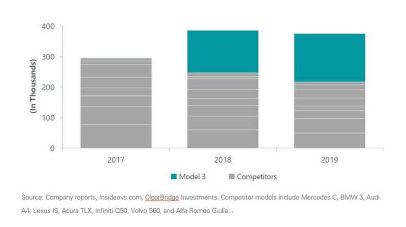 圖二:特斯拉在高檔中型轎車類別中占據(jù)領(lǐng)先地位