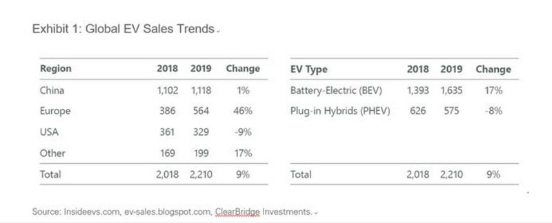2019年,乘用車總銷量下滑,插電式電動(dòng)汽車 (EVs)銷量繼續(xù)增長,市場份額不斷擴(kuò)大。全球范圍內(nèi),電動(dòng)汽車(電池電力和插電式混合動(dòng)力車)銷量增長了約9%,達(dá)到220萬輛(表1)。電動(dòng)汽車市場結(jié)構(gòu)繼續(xù)向純電池電動(dòng)汽車轉(zhuǎn)變,其中純電池電動(dòng)汽車銷量增長17%,達(dá)到160萬輛,占所有電動(dòng)汽車的74%。
