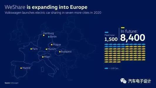 2019年開始大眾汽車開始打造“WeShare”純電動(dòng)汽車分時(shí)租賃服務(wù)。一開始,在柏林投放1500輛e-Golf與500輛e-up!,從今年開始開始推動(dòng)MEB平臺(tái)的ID系列車型。如下圖所示,接下來(lái)從Q1開始會(huì)漢堡啟動(dòng),然后擴(kuò)展至歐洲的其他城市,大眾通過(guò)Schwarz集團(tuán)公司合作保障其共享車隊(duì)的運(yùn)營(yíng),通過(guò)Lidl和Kaufland超市連鎖店建立戰(zhàn)略伙伴關(guān)系,在60家Lidl和10家Kaufland為電動(dòng)汽車安裝140個(gè)公共充電站,在特定時(shí)間內(nèi)為WeShare車隊(duì)充電,提高充電站的使用率。