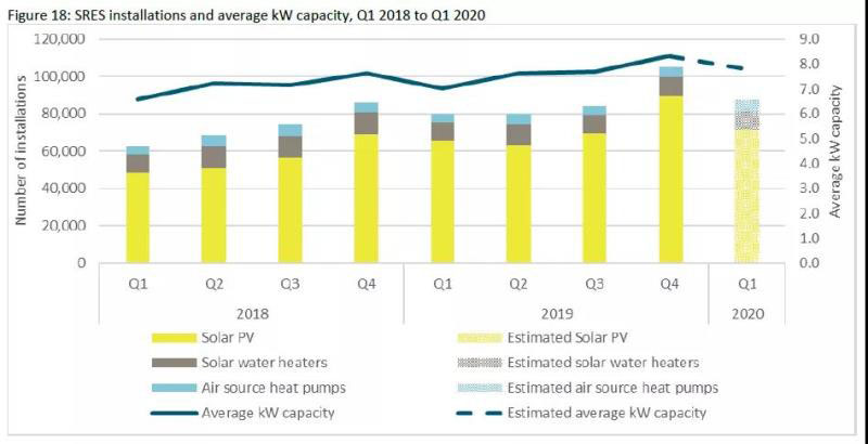 圖片:2018年第一季度至2020年第一季度,小型可再生能源系統(tǒng)的裝機設(shè)施及平均發(fā)電容量柱狀圖。來源:CER