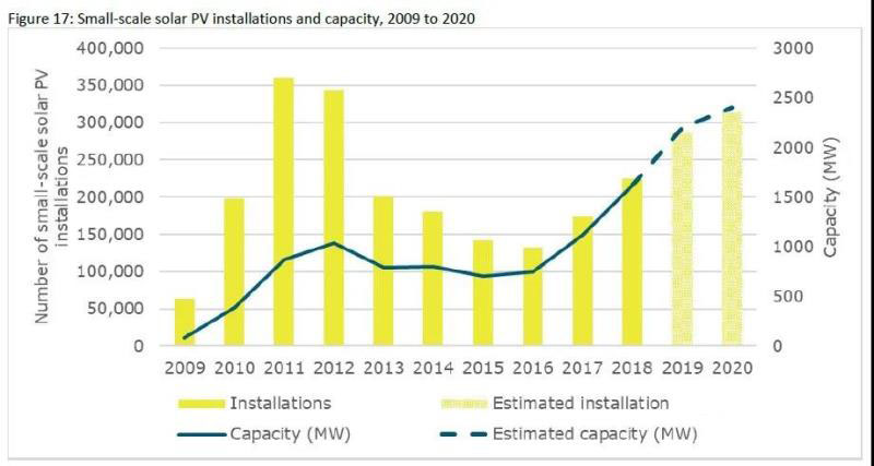 自小型可再生能源計劃(SRES)實施以來,總裝機容量達10.3GW,其中99.9%來自小型光伏發(fā)電,其余來自小型風(fēng)能和水能發(fā)電。到2019年,估計澳大利亞小型光伏發(fā)電裝機容量已達到22GW。