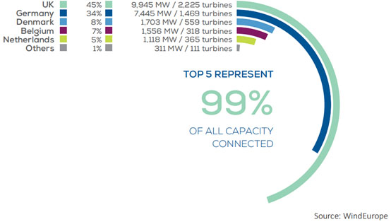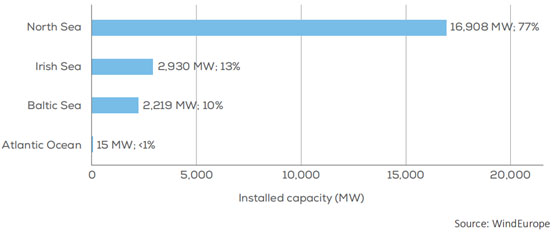 2019年,超過99%的新增并網(wǎng)裝機在北海。只有Windfloat Atlantic浮式風電場位于大西洋,1臺風電機組并網(wǎng)。
