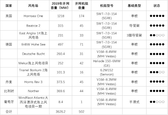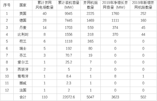 截止2019年底歐洲海上風電并網(wǎng)情況一覽表
