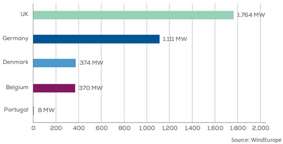 2019年,歐洲海上風電并網(wǎng)容量凈增長3,623MW,創(chuàng)下了年度增長最高記錄;2019年新增裝機容量總計3,627MW。新增裝機容量中,英國1,764 MW,德國1,111MW,丹麥374 MW,比利時370 MW,葡萄牙8 MW。