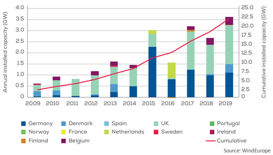 截至2019年底,歐洲海上風電累計裝機容量為22,072MW,覆蓋12個國家,110個海上風電場(包括部分并網(wǎng)的風電場)的5,047臺并網(wǎng)風電機組。