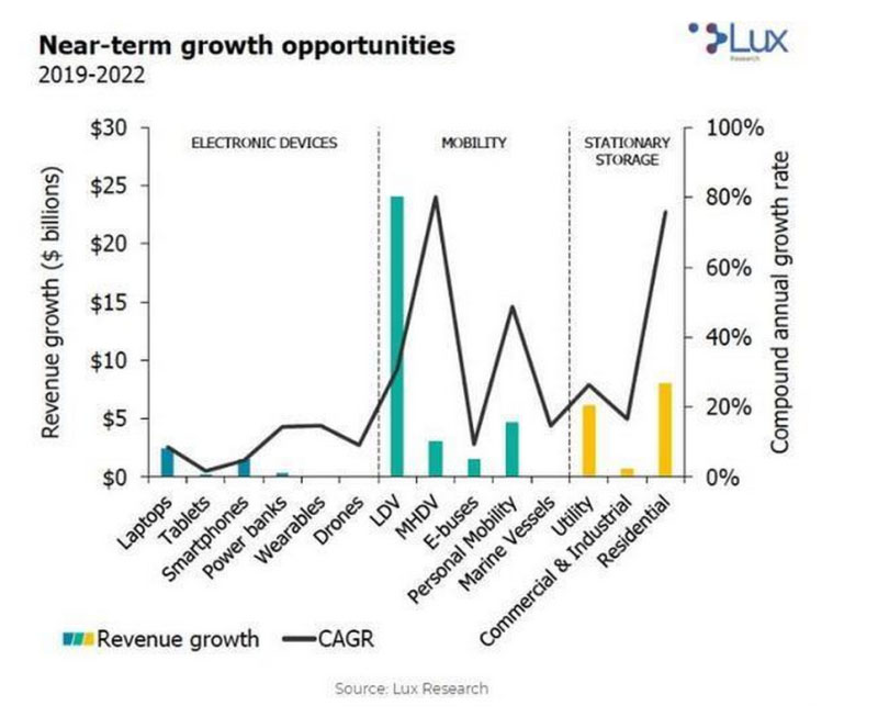 Lux Research表示,智能手機(jī)、筆記本電腦、平板電腦、移動(dòng)電源和民用無(wú)人機(jī)的市場(chǎng)都已經(jīng)達(dá)到了臨界規(guī)模,而且只會(huì)隨著人口的增長(zhǎng)而增長(zhǎng)。