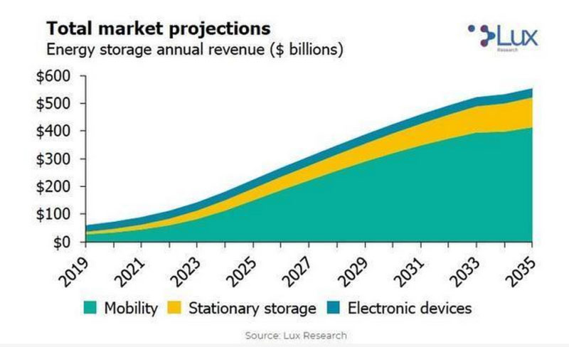 就每年的電池電量而言,汽車將扮演更重要的角色,到2035年占市場(chǎng)的91%。
