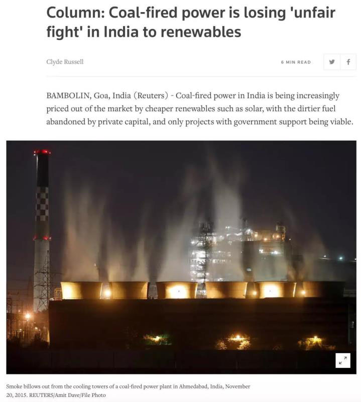 據(jù)路透社報(bào)道,印度的燃煤發(fā)電越來越被太陽能等更便宜的可再生能源擠出市場,印度的煤炭行業(yè)處于困境之中。印度煤電遇到的問題原因主要是經(jīng)濟(jì)上的,而不是政策上的??稍偕茉纯稍谫忞妳f(xié)議中以每千瓦時(shí)3盧比(4.2美分)的價(jià)格提供,而現(xiàn)有的在運(yùn)煤炭廠發(fā)電量以每千瓦時(shí)4盧比的價(jià)格提供,而新建煤電廠的價(jià)格在每千瓦時(shí)5至6盧比之間。