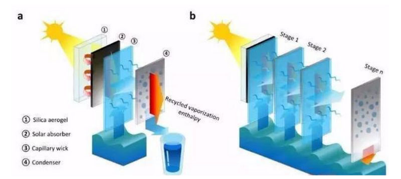 當(dāng)然,對海水或苦咸水進(jìn)行淡化的方法有很多,如常規(guī)蒸餾法、離子交換法、滲析法、反滲透膜法以及冷凍法等。這些傳統(tǒng)的方法除需要消耗大量的燃料或電力外,還會污染空氣并造成溫室效應(yīng)。因此,95%的能耗來自太陽能,幾乎不消耗石油、天然氣、煤炭等常規(guī)能源,綠色無污染,所得淡水純度高的太陽能海水淡化技術(shù)得到了廣泛應(yīng)用。
