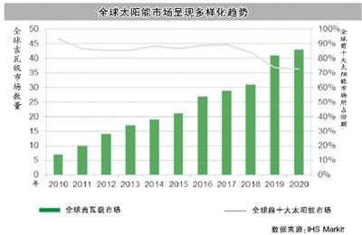 IHS Markit預(yù)計(jì),2020年,全球前十大太陽(yáng)能市場(chǎng)所占份額將從2010年的94%下滑至73%,下降逾20個(gè)百分點(diǎn)。同時(shí),今年將有43個(gè)國(guó)家的太陽(yáng)能發(fā)電新增裝機(jī)超吉瓦級(jí)規(guī)模,地理覆蓋范圍也更加廣泛。而在2010年,全球吉瓦級(jí)市場(chǎng)的數(shù)量?jī)H為7個(gè),且分布較為集中,大多位于歐洲。