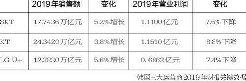 在2019年5G商用元年里,由于5G第一波高端用戶的終端補(bǔ)貼和營(yíng)銷費(fèi)用提升,韓國(guó)三大運(yùn)營(yíng)商在2019年的整體營(yíng)業(yè)利潤(rùn)都同比下滑。其中,KT同比下滑最多,為8.8%;LG U﹢下滑最少,為7.4%。
