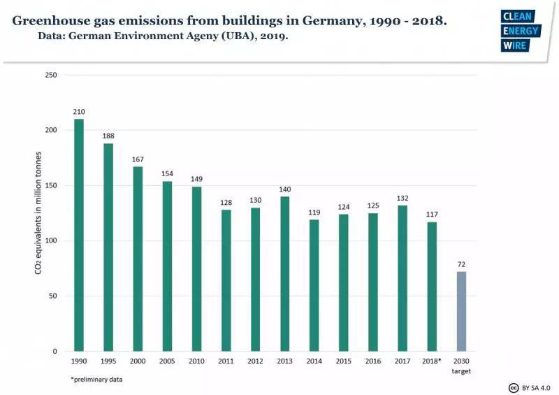 由于德國(guó)2200萬(wàn)棟建筑物中超過(guò)90%是用石油和天然氣作為燃料的,因此該行業(yè)的排放非常高。德國(guó)政府的目標(biāo)是到2050年實(shí)現(xiàn)“近零排放的建筑”。但是,盡管建筑部門(mén)碳排放量自1990年以來(lái)下降了44%,但自2011年以來(lái)基本上停滯不前。節(jié)能建筑對(duì)于供暖轉(zhuǎn)型至關(guān)重要,經(jīng)濟(jì)部估計(jì)到2020年代中期,德國(guó)1900萬(wàn)棟居民住宅中約有一半需要翻新,目標(biāo)是每年實(shí)現(xiàn)2%的翻新改造速度,但目前約為所需速度的一半。原因是這些數(shù)以百萬(wàn)計(jì)的建筑物有數(shù)以百萬(wàn)計(jì)的所有者,獲得他們的同意以接受更嚴(yán)格的排放政策和激勵(lì)措施是政治上的“老大難”。