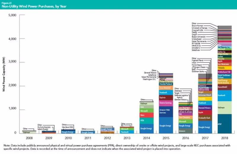 在過去的十年中,出現(xiàn)了一個振奮人心的趨勢——美國的企業(yè)直接依靠風(fēng)力發(fā)電來滿足其電力需求。因風(fēng)能具備在較長時期內(nèi)鎖定固定利率的能力,再加上其清潔能源優(yōu)勢,使企業(yè)選擇風(fēng)電變得更加容易,這一趨勢也將越發(fā)明顯。如今,已有超過144家美國企業(yè)簽訂了15 GW的風(fēng)力發(fā)電合同,以滿足企業(yè)的能源需求。預(yù)計到2030年,美國更多的企業(yè)和工業(yè)客戶將額外購買85 GW的可再生能源電力,風(fēng)電行業(yè)的未來前景無疑將更加光明。