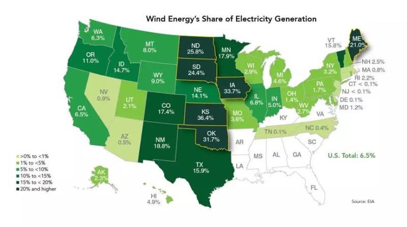 風(fēng)能在美國電力的占比超過7%,有六個州的電力占比甚至超過20%