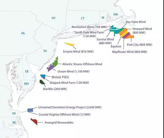 陸上風(fēng)電的蓬勃發(fā)展也延伸到了海上,2019年,東海岸沿線有六個州宣布了共計16300 MW的海上風(fēng)電建設(shè)目標。這比之前承諾過的海上風(fēng)電建設(shè)目標翻了一番還多,現(xiàn)在已超25000MW。新澤西州州長Phil Murphy宣布將于2035年之前將花園州的海上風(fēng)電發(fā)展目標擴大到7500MW。
