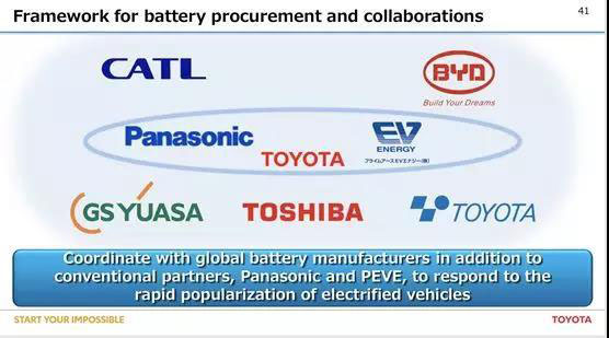 而在去年6月,豐田對外公開了其電動化戰(zhàn)略規(guī)劃及動力電池采購規(guī)劃,在這個規(guī)劃中,進(jìn)入采購體系的電池包括松下、CATL、比亞迪、湯淺、東芝,而在該動力電池供應(yīng)鏈的聯(lián)盟中,松下和豐田與松下的合資公司處于最為核心的位置。