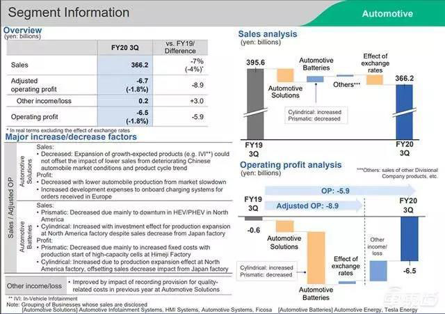 就在最近,松下發(fā)布了2019年第四季度(即2020財年第三季度)財報,其中,在汽車業(yè)務(wù)方面,松下第四季度的銷售額達(dá)到3662億日元(約合人民幣236億元),同比下滑7%。營業(yè)利潤虧損65億日元(約合人民幣4億元),虧損幅度同比有所擴大。