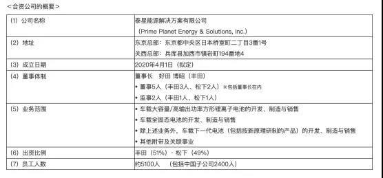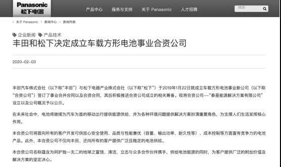 繼2019年1月22日豐田與松下就成立車載方形電池事業(yè)公司簽訂了事業(yè)合并合同以及合資合同一年之后,2月3日,雙方確定將合資公司定名為“泰星能源解決方案有限公司”,擬定于2020年4月1日成立,豐田與松下的股比分別為51%和49%。