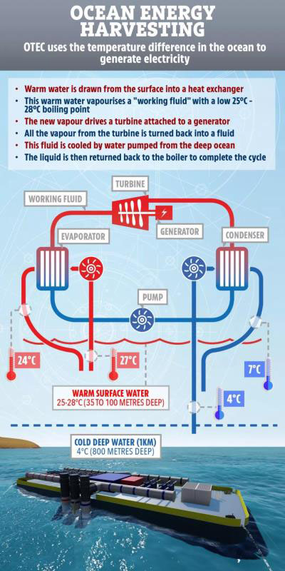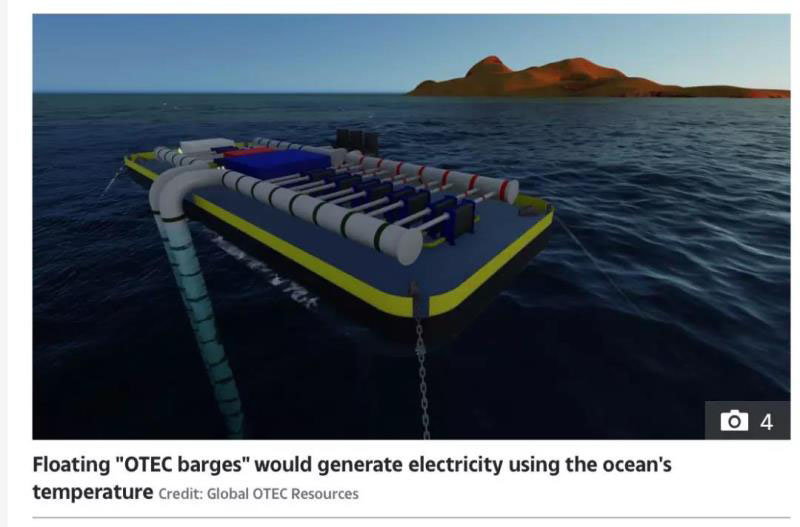 英國發(fā)明家Dan Grech和Hayden Ashfield設(shè)計“ OTEC駁船”,利用海洋溫暖的地表水和接近冰點的深度之間的溫度差來發(fā)電。該系統(tǒng)的能源收集和轉(zhuǎn)化完全在海上完成,這意味著不需要土地。像太陽能和風(fēng)能一樣,隨著批量生產(chǎn)駁船,OTEC的價格可能迅速下降,可以擴大這些駁船的規(guī)模,為整個國家提供動力。在未來十年中,我們有望看到“OTEC發(fā)電廠”漂浮在美洲或非洲大陸的海岸上,這些海岸可以用可靠的基本負荷電力為整個城市和州供電。