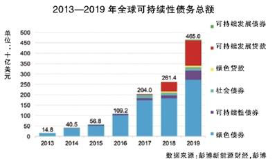 數(shù)據(jù)顯示,2019年全年,全球總計(jì)發(fā)行可持續(xù)性債券4650億美元,較2018年的2610億美元增長(zhǎng)78%。多國(guó)政府及大型企業(yè)都發(fā)行了多種類(lèi)型的可持續(xù)性債券。其中,荷蘭皇家殼牌公司等能源企業(yè)也發(fā)行了數(shù)量可觀的可持續(xù)性債券。截至2019年底,全球可持續(xù)性債務(wù)的未償還金額已突破1萬(wàn)億美元大關(guān),達(dá)1.17萬(wàn)億美元。