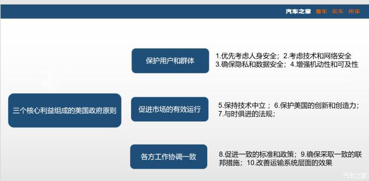 從美國政府發(fā)布的自動駕駛相關(guān)行政文件來看,均指向同一個目標:就是保持美國在自動駕駛領(lǐng)域的領(lǐng)先地位。美國政府層面希望聯(lián)合聯(lián)邦38個政府部門,及各類企業(yè)和志愿者組織,以促使各組織之間統(tǒng)一協(xié)作和信息共享。同時,在監(jiān)管方面盡量簡化和統(tǒng)一口徑,在政策上給與諸多優(yōu)惠,為自動駕駛技術(shù)發(fā)展清除障礙。AV4.0充分介紹了美國聯(lián)邦政府各部門的努力,主要體現(xiàn)在協(xié)同、監(jiān)管、政策等方面。最終完成自動駕駛與國家交通運輸系統(tǒng)有效融合,實現(xiàn)自動駕駛車輛無縫、安全運行。