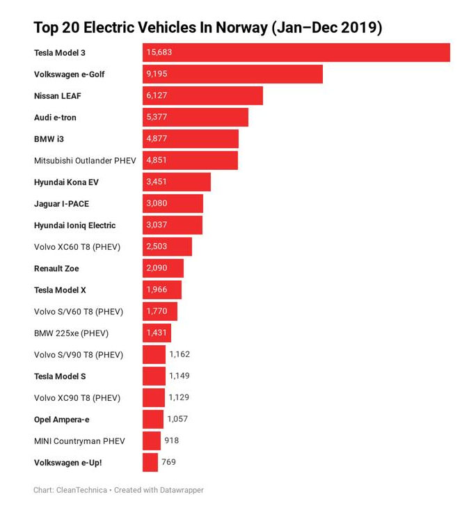 對(duì)于挪威以外的人來(lái)說(shuō),令人驚訝的結(jié)果可能是排名第二的大眾電子高爾夫,它在大多數(shù)市場(chǎng)中并不是特別“熱門(mén)”。但在插電式電動(dòng)汽車(chē)市場(chǎng),這款車(chē)型占有顯著的11%,在挪威總體上排名第二。