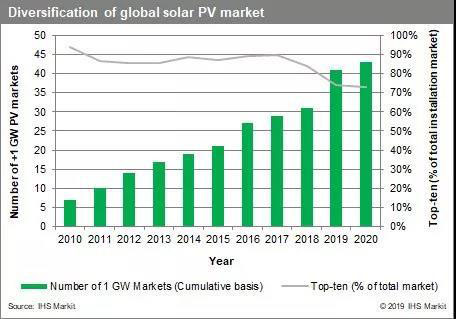 在可預(yù)見(jiàn)的將來(lái),像中國(guó)這樣的大型市場(chǎng)仍將繼續(xù)占領(lǐng)全球裝機(jī)的很大份額。但隨著其他地方產(chǎn)能增加,未來(lái)幾年全球太陽(yáng)能裝機(jī)增長(zhǎng)對(duì)中國(guó)市場(chǎng)的依賴將持續(xù)減少除中國(guó)以外的全球領(lǐng)先市場(chǎng)的安裝量在2019年增長(zhǎng)了53%,預(yù)計(jì)到2020年將繼續(xù)保持兩位數(shù)的增長(zhǎng)??傮w而言,前十大太陽(yáng)能市場(chǎng)的總體市場(chǎng)份額預(yù)計(jì)將下降至從2010年的94%降至73%。