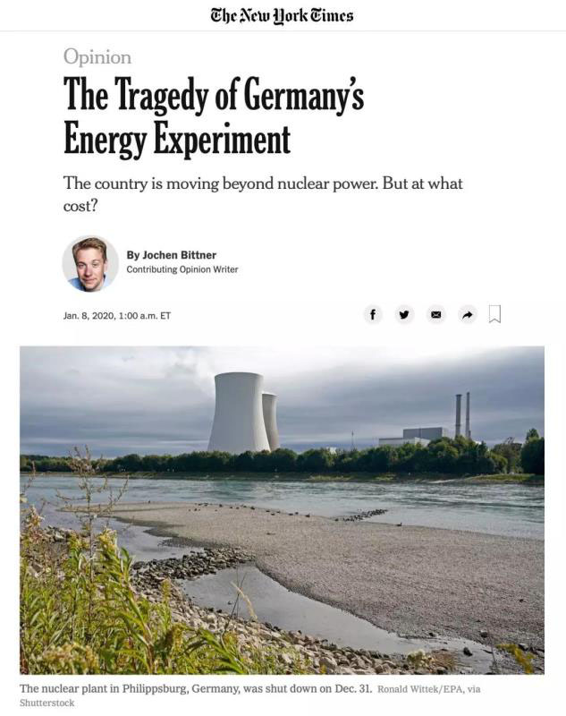 美國《紐約時報》發(fā)表署名Jochen Bittner的專欄文章評述德國的能源轉(zhuǎn)型,題目是:The Tragedy of Germany’s Energy Experiment(德國能源實驗的悲劇),還有一個副標題:The country is moving beyond nuclear power. But at what cost?(德國放棄核能,但是成本有多大?)