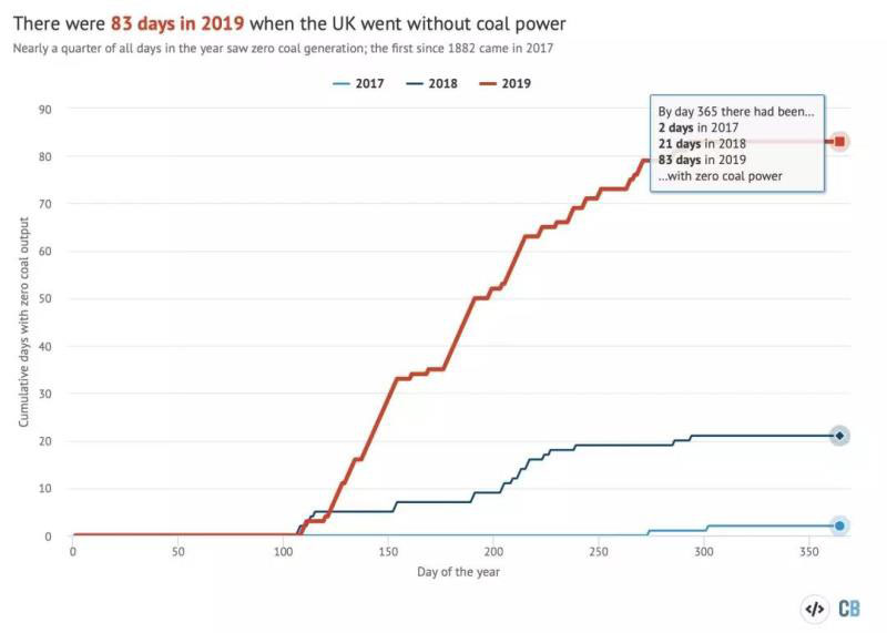 2019年全年共有83天煤電為零,而2017年只有2天煤電為零。