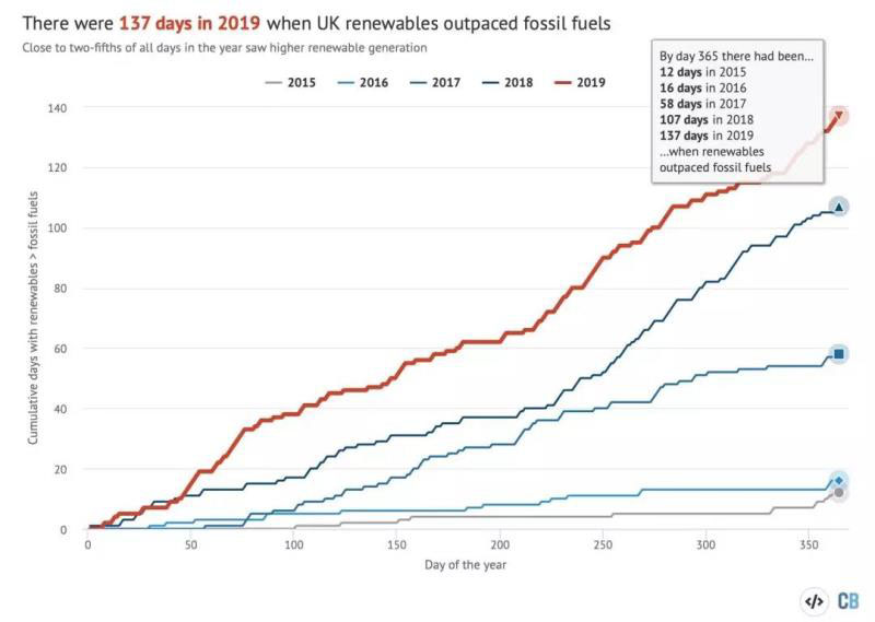 2019年全年總共有137天可再生能源發(fā)電量超過化石能源發(fā)電量;而2015年只有12天可再生能源發(fā)電量超過化石能源發(fā)電量。