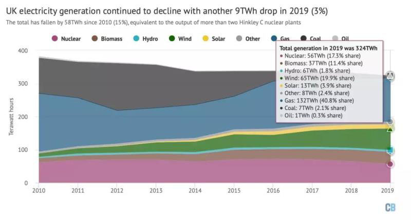 據英國能源智庫Carbon Brief匯總的數據,2019年英國發(fā)電324TWh,電源結構如下: