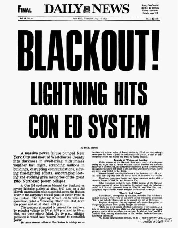 無獨有偶,42年前的同一天,1977年7月13日,紐約同樣發(fā)生了大停電,而且比這次嚴重得多,不像這次只是曼哈頓一個地區(qū)停電,而是整個紐約都陷入了黑暗之中。這次停電持續(xù)了25個小時,是美國歷史上最嚴重的大停電之一。