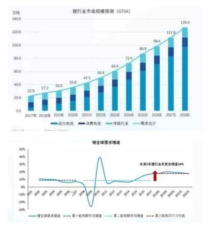 2018年鋰行業(yè)全球的需求大致在27.2萬(wàn)噸碳酸鋰當(dāng)量,約330億人民幣左右的市場(chǎng)規(guī)模;到了2028年,鋰行業(yè)市場(chǎng)規(guī)模將超過(guò)100萬(wàn)噸的碳酸鋰當(dāng)量,單單鋰行業(yè)將有望達(dá)到千億市場(chǎng),成功完成從“小金屬”向“大金屬”的成長(zhǎng),并持續(xù)高速增長(zhǎng)。