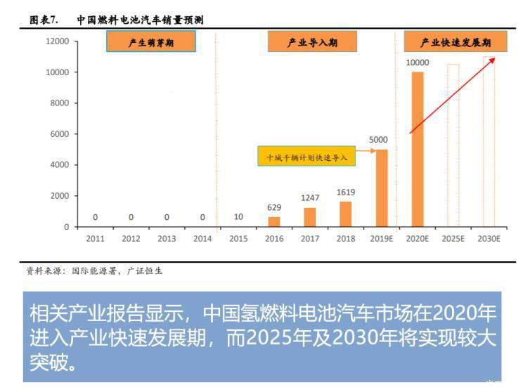 根據(jù)畢馬威此前發(fā)布的報(bào)告顯示,2020年氫燃料電池汽車產(chǎn)量將出現(xiàn)爆發(fā)性增長;2025年燃料電池技術(shù)有望實(shí)現(xiàn)突破,成本將大幅下降;到2030年,中國氫燃料電池汽車產(chǎn)銷量將達(dá)數(shù)十萬輛。無獨(dú)有偶,廣證恒生研究所此前也發(fā)布的一份產(chǎn)業(yè)報(bào)告顯示,中國氫燃料電池汽車2020年將達(dá)到10000輛的規(guī)模,從2020年開始中國氫燃料電池汽車市場將迎來產(chǎn)業(yè)快速發(fā)展期。也就是說,從市場空間來看,本土作戰(zhàn)的中國車企更具優(yōu)勢(shì)。