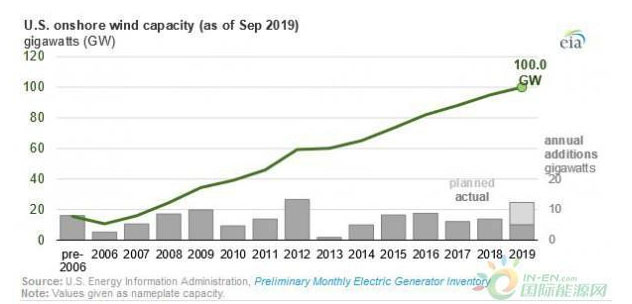 近日,美國能源信息署(EIA)月度發(fā)電報告(Preliminary Monthly Electric Generator Inventory)數(shù)據(jù)顯示,截至2019年9月底,美國累計陸上風(fēng)電裝機量超100GW。